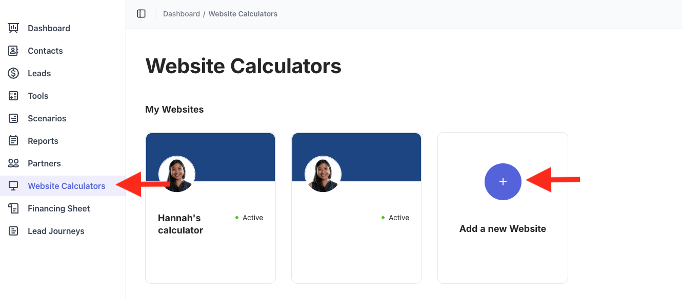 In your Web Admin Dashboard, click Web Calculators on the left-hand side, then select Add a New Website.