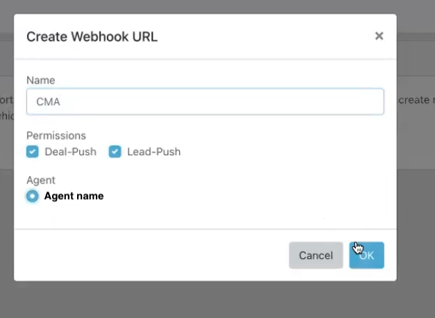 Step 6: Copy the Deals Webhook URL or select Create Webhook URL if one does not already exist. When creating the Webhook URL, fill in the pop-up box the same as the photo below.