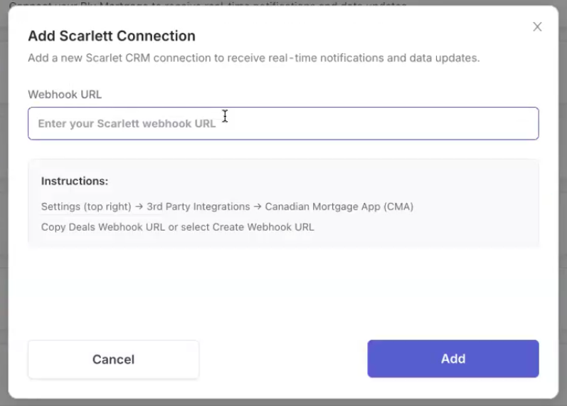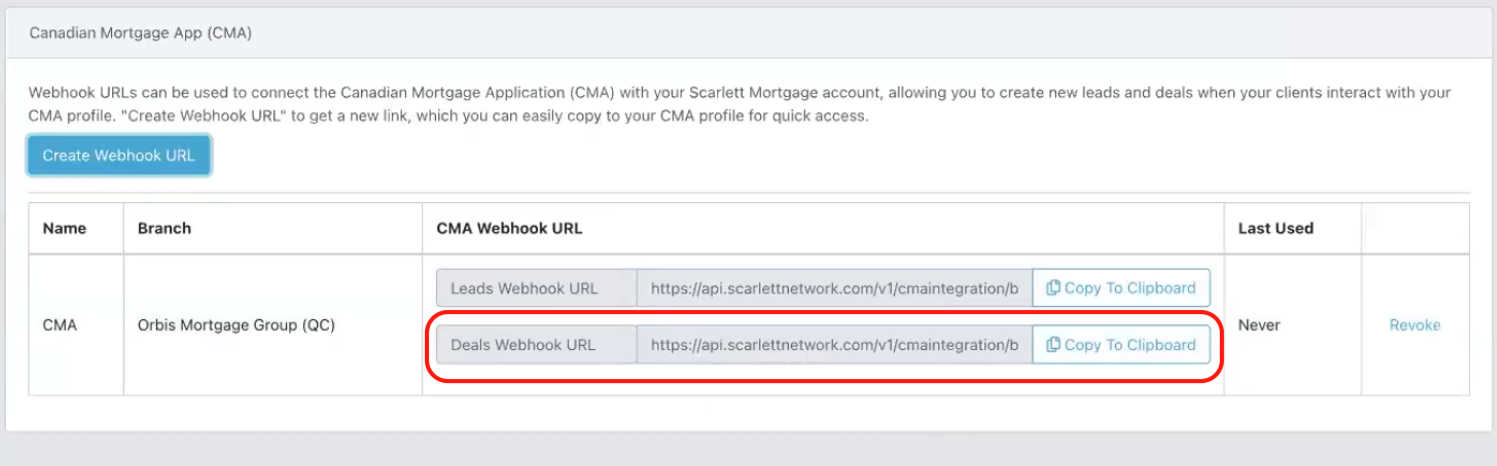 Step 7: Return to the Canadian Mortgage App Web Admin Dashboard and paste the Webhook URL to complete the connection.