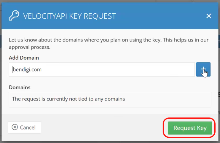 Step 8: Create a new API key if one does not already exist. Under the website domain type in bendigi.com tap on the plus sign, then request key