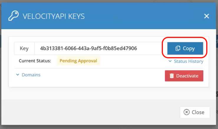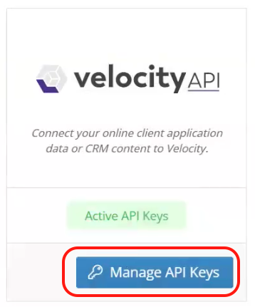 Step 9: The pop-up window will close and land on the Velocity API showing Active API Keys. Tap on Manage Key, then copy the API Key.